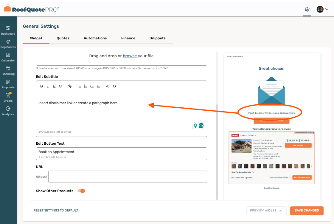 RoofQuote PRO allows you to add disclaimers at key points in the quoting process to ensure homeowners see important information. Disclaimers can be added at the product level, within the RQP leads form, or on the Thank You Screen. Each placement gives you control over when and how messaging is presented, helping set clear expectations and maintain transparency with homeowners throughout their experience.